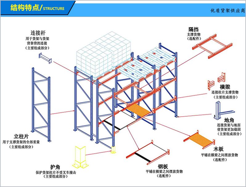 4、可以增加立柱护脚、防撞杆,防止叉车碰撞;为了层载更安全 还可在横梁上安置横梁搁挡、层板、网片跨梁等附属设施。