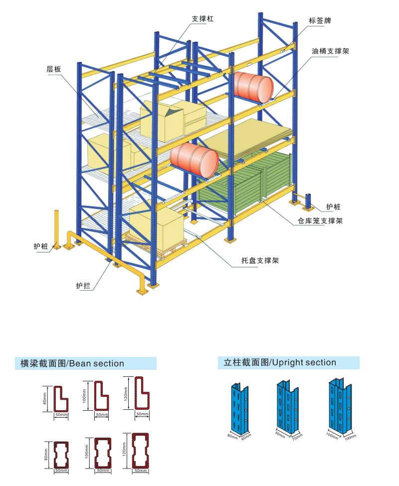 重型横梁式货架是目前使用应用广泛的货架类型之一,具有较强的通用性,可适应各种类型的货物,可按货物尺寸要求调解横梁高度。重型横梁式货架主要由立柱、横梁、横撑、斜撑以及自锁螺栓组装而成。横梁与立柱的连接多采用机械式的锁扣结构,可随意拆装组合。横梁采用特制的冷轧P型闭口梁;该结构具有简单可靠、重量轻、承载力强、造价低的特点;柱卡与立柱连接时配有特殊设计安全销,可以确保横梁在外力撞击下不会脱落。可根据存储单元集装设备的特性加装如:隔档、钢层板(木层板)、金属丝网层、仓储笼导轨、油桶架等功能性附件。根据用户实际使用情况:托盘载重要求、托盘尺寸、仓库实际空间、叉车实际提升高度,可提供不同规格的横梁式重型货架以供客户选择。