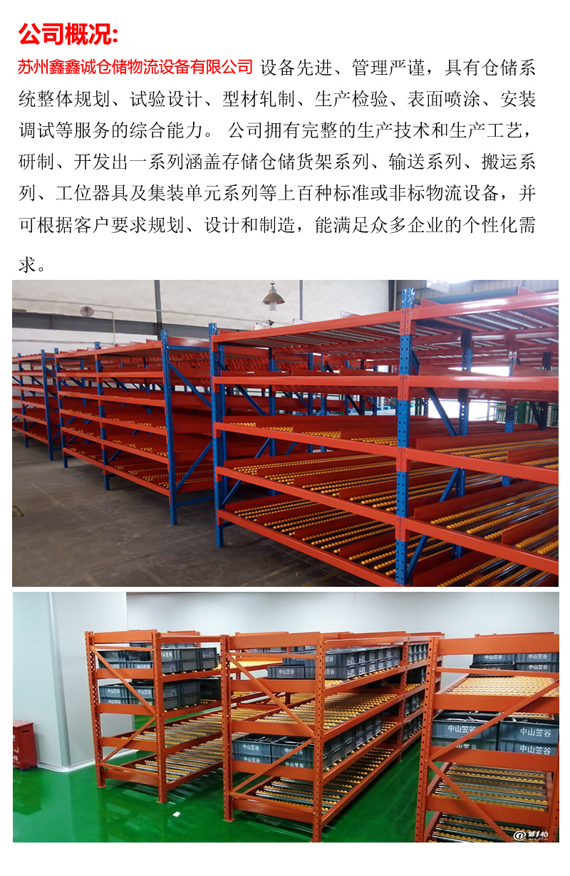 嘉兴鑫鑫诚仓储物流设备有限公司是一家专业生产仓储物流设备、工位器具的公司,产品包括:重型货架、模具架、阁楼平台货架、悬臂货架、钢平台、拆装货架、隔离网片、流利货架、中型货架、贯通货架、工作台、巧固架以及非标货架定制等,作为国内专业的物流设备供应商之一,我们拥有高素质的管理、技术人员,稳定的员工群体,精良的数控设备,良好的技术,完善及时的售后服务。保证了企业的稳定发展,让我们的产品品质得到保障,也让我们的产品更加具有专业化、合理化、人性化、系统化,确保了我们在行业内的位置。